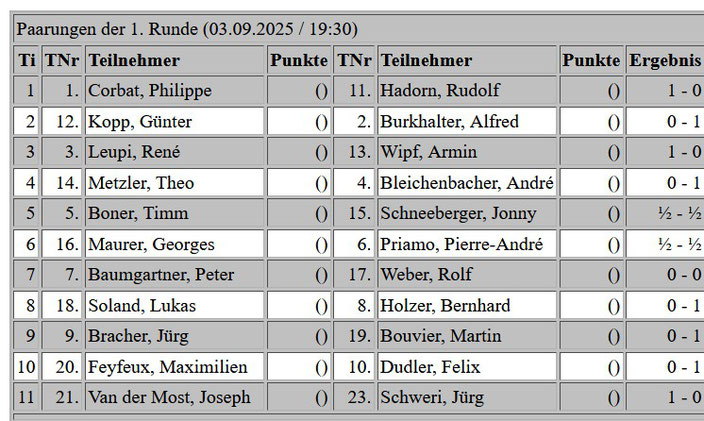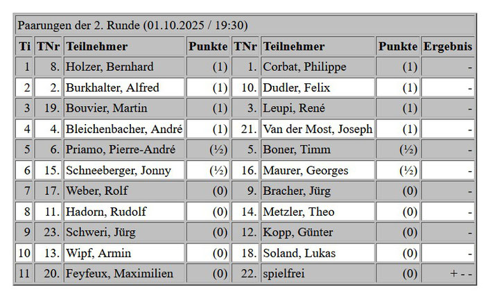 Paarungen 2. Runde 01.10.2025 Klub Open 2025 / 2026